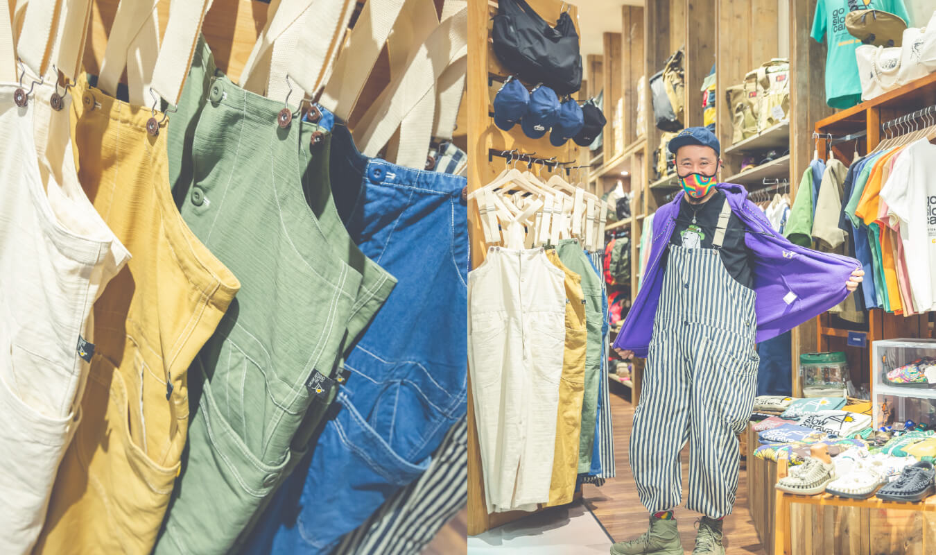 僕は私服もほぼゴースローキャラバンですね。今日着ているのは、今年の春に新登場した「わきポケオーバーオール」。ブランド立ち上げ当初から「わきポケパンツ」は定番としてあるんですけど、そのオーバーオールバージョンです。名前のとおり、わきに大きなポケットがついたデザインがポイント。水筒3本くらい入っちゃうんじゃないですかね(笑)。前がジップになっていてトイレも行きやすいし、ホントに使えるのでもう一本違う色を買おうと思っています。