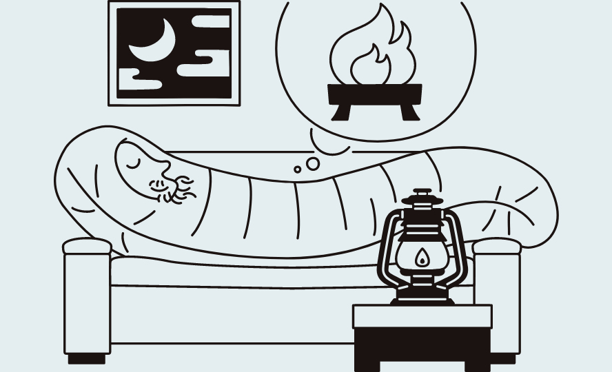 仕事以外のときは完全にオフになりたいので、なるべく生活感を出したくない。その結果家でもキャンプみたいに過ごしています。例えば、家でもシェラカップでご飯を炊いたり、ガスバーナーに鉄板をのせてお肉を焼いたり…。最近は、家に帰ったらまずランタンに火をつけるのが習慣。炎の揺らぎって抜群に癒し効果があるみたいで、それをすごく実感しています。あと、寝るときはソファに寝袋で寝るんですよ。いい寝袋ってめちゃくちゃ気持ちよくて、5分もあれば寝られますよ。
